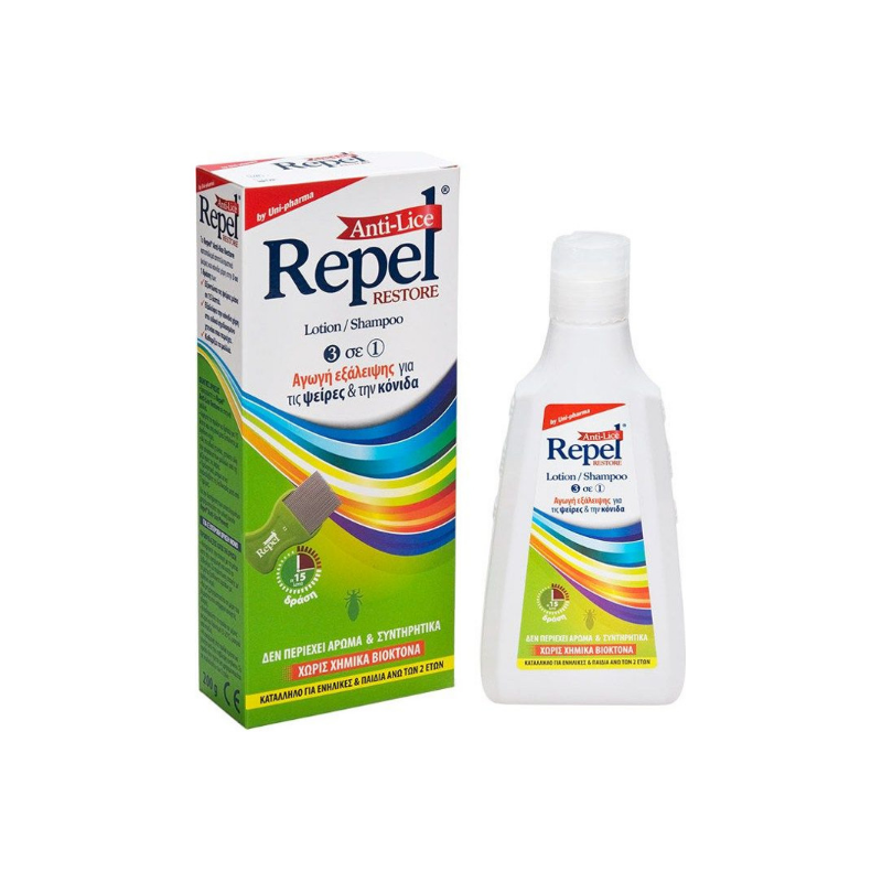 Ολοκληρωμένη αντιφθειρική αγωγή Uni-Pharma Repel Anti-lice Restore, που αποτελείται από λοσιόν, σαμπουάν, καθώς και ένα ειδικά σχεδιασμένο χτενάκι που εξαλείφει τις κόνιδες.
